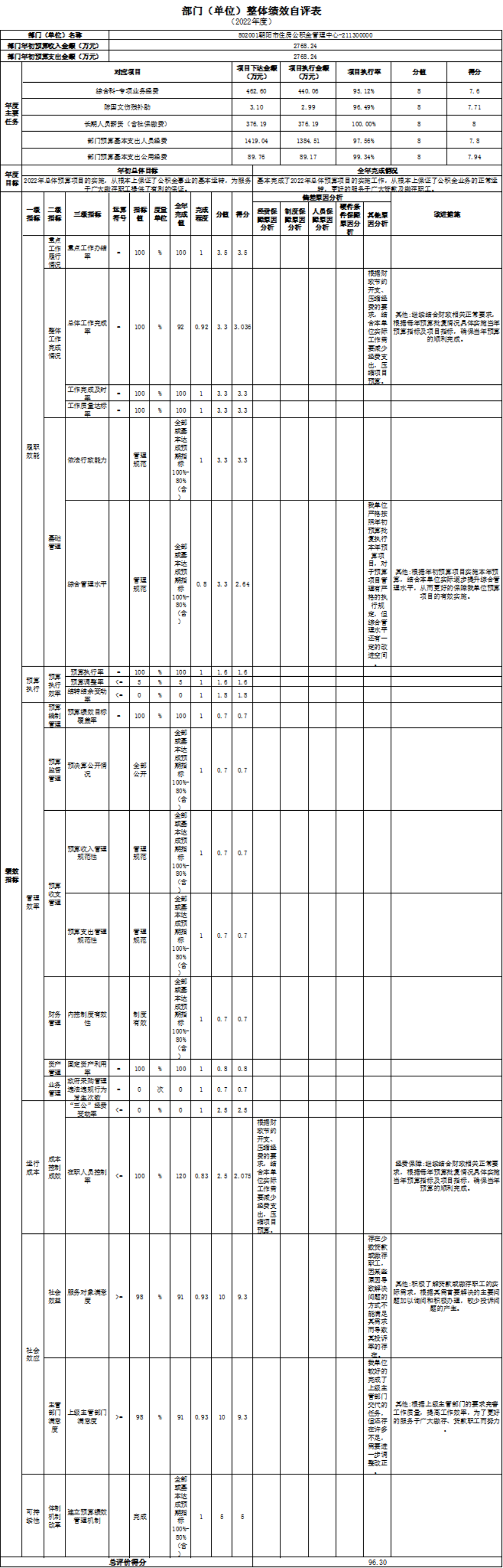 组织对1个单位开展整体绩效自评,涉及资金2638.42万元,自评平均分96.30分。《部门(单位)整体绩效自评表》见附件。