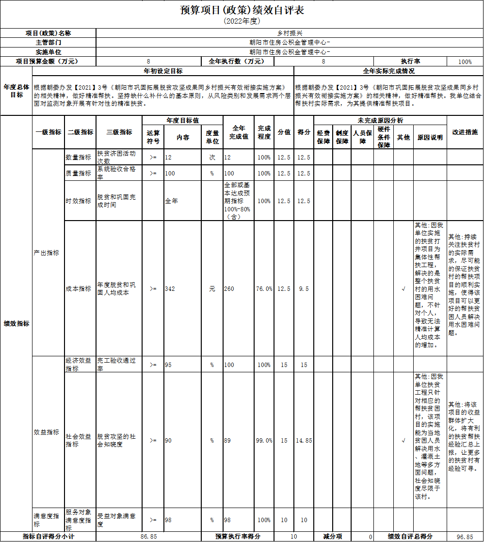(1)“乡村振兴”项目自评综述:根据年初设定的绩效目标,项目自评得分96.85分。项目全年预算数为8万元,执行数为8万元,完成预算的100%。项目绩效目标完成情况:一是全年预计完成扶贫救济活动12次,我单位实际完成12次;二是全年预计乡村振兴项目完工验收率大于95%,我单位实际完工验收率达到100%。发现的主要问题及原因:一是因我单位实施的扶贫打井项目为集体性帮扶工程,解决的是整个扶贫村的用水困难问题,不针对个人,导致无法精准计算人均成本的增加;二是因我单位扶贫工程只针对相应的帮扶贫困村,该项目的实施能为当地贫困人员解决用水、灌溉土地等多方面问题,社会知晓度尽限于该村。下一步改进措施:一是持续关注扶贫村的实际需求,尽可能地保证扶贫村的帮扶项目的顺利实施,使得该项目可以更好的帮扶贫困人员解决用水困难问题;二是将该项目的收益群体扩大化,将有利于扶贫帮扶经验汇总上报,让更多的扶贫村有经验可寻。