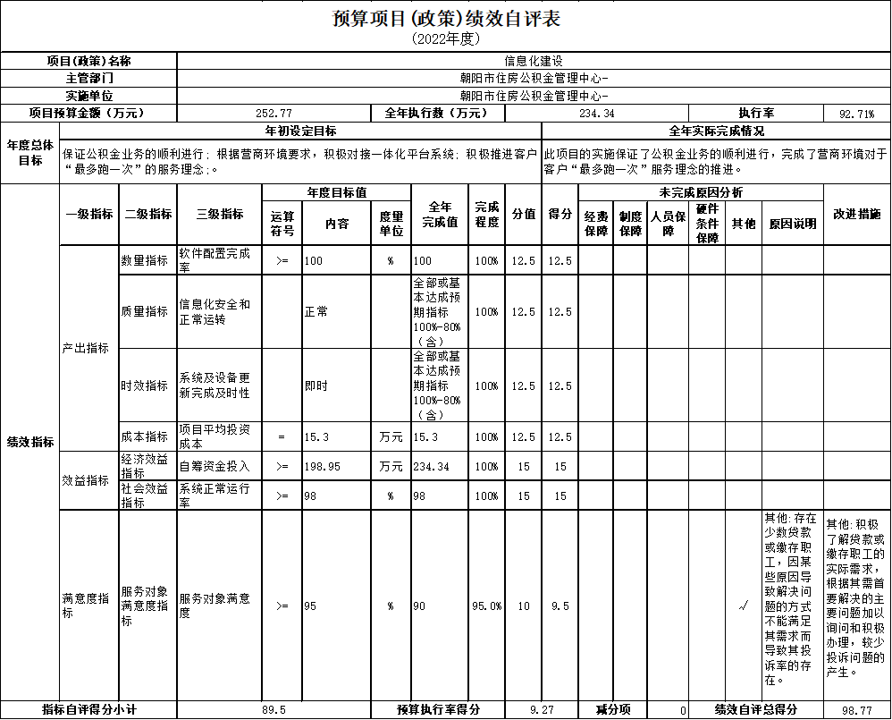 (4)“信息化建设”项目自评综述:根据年初设定的绩效目标,项目自评得分98.77分。项目全年预算数为252.77万元,执行数为234.34万元,完成预算的92.71%。项目绩效目标完成情况:一是该项目的质量指标做到了信息化安全和正常运转;二是系统正常运行率达到了98%以上。发现的主要问题及原因:存在少数贷款或缴存职工,因某些原因导致解决问题的方式不能满足其需求而导致其投诉率的存在。下一步改进措施:积极了解贷款或缴存职工的实际需求,根据其需首要解决的主要问题加以询问和积极办理,较少投诉问题的产生。