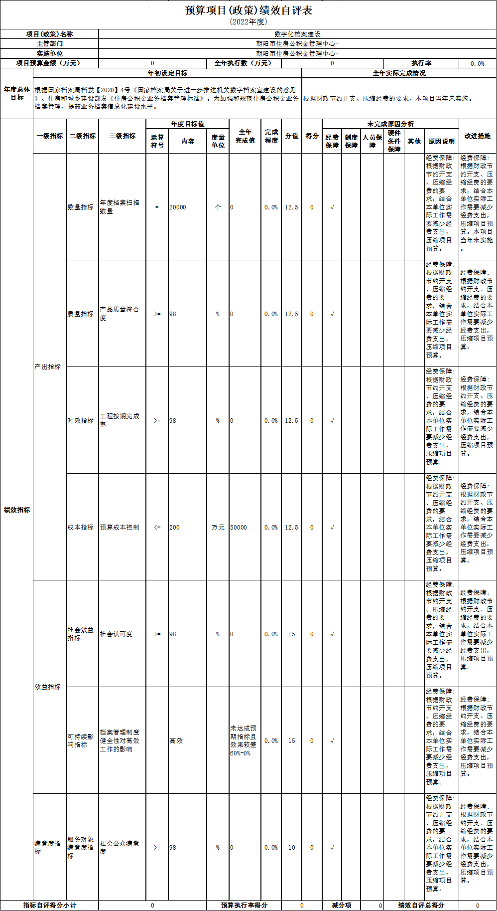 (3)“数字化档案建设”项目自评综述:根据年初设定的绩效目标,项目自评得分0分。项目全年预算0万元,执行数为0万元,完成年初预算的0%。