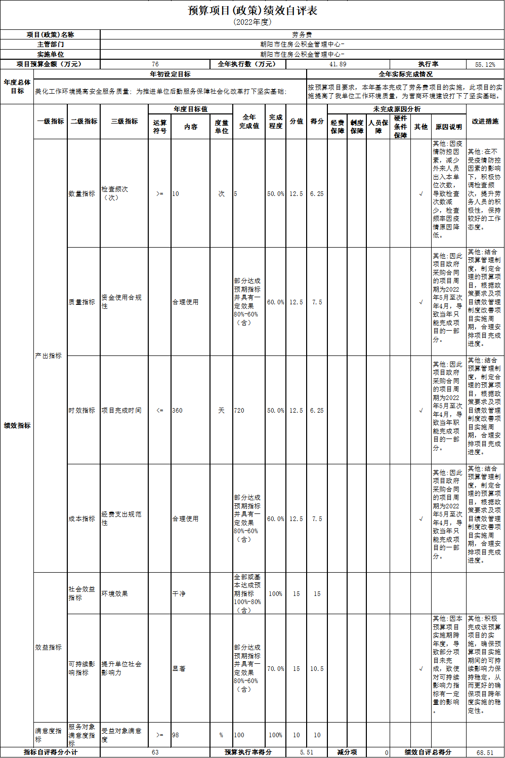 (2)“劳务费”项目自评综述:根据年初设定的绩效目标,项目自评得分68.51分。项目全年预算数为76万元,执行数为41.89万元,完成预算的55.12%。项目绩效目标完成情况:一是我单位能够合理使用经费,保证了经费支出规范性;二是该项目的实施显著提升了我单位的社会影响力。发现的主要问题及原因:一是因疫情防控因素,减少外来人员出入本单位次数,导致检查次数减少,检查频率因疫情原因降低;二是因此项目政府采购合同的项目周期为2022年5月至次年4月,导致当年只能完成项目的一部分。下一步改进措施:一是在不受疫情防控因素的影响下,积极协调检查频次,提升劳务人员的积极性,保持较好的工作态度;二是结合预算管理制度,制定合理的预算项目,根据政策要求及项目绩效管理制度改善项目实施周期,合理安排项目完成进度。
