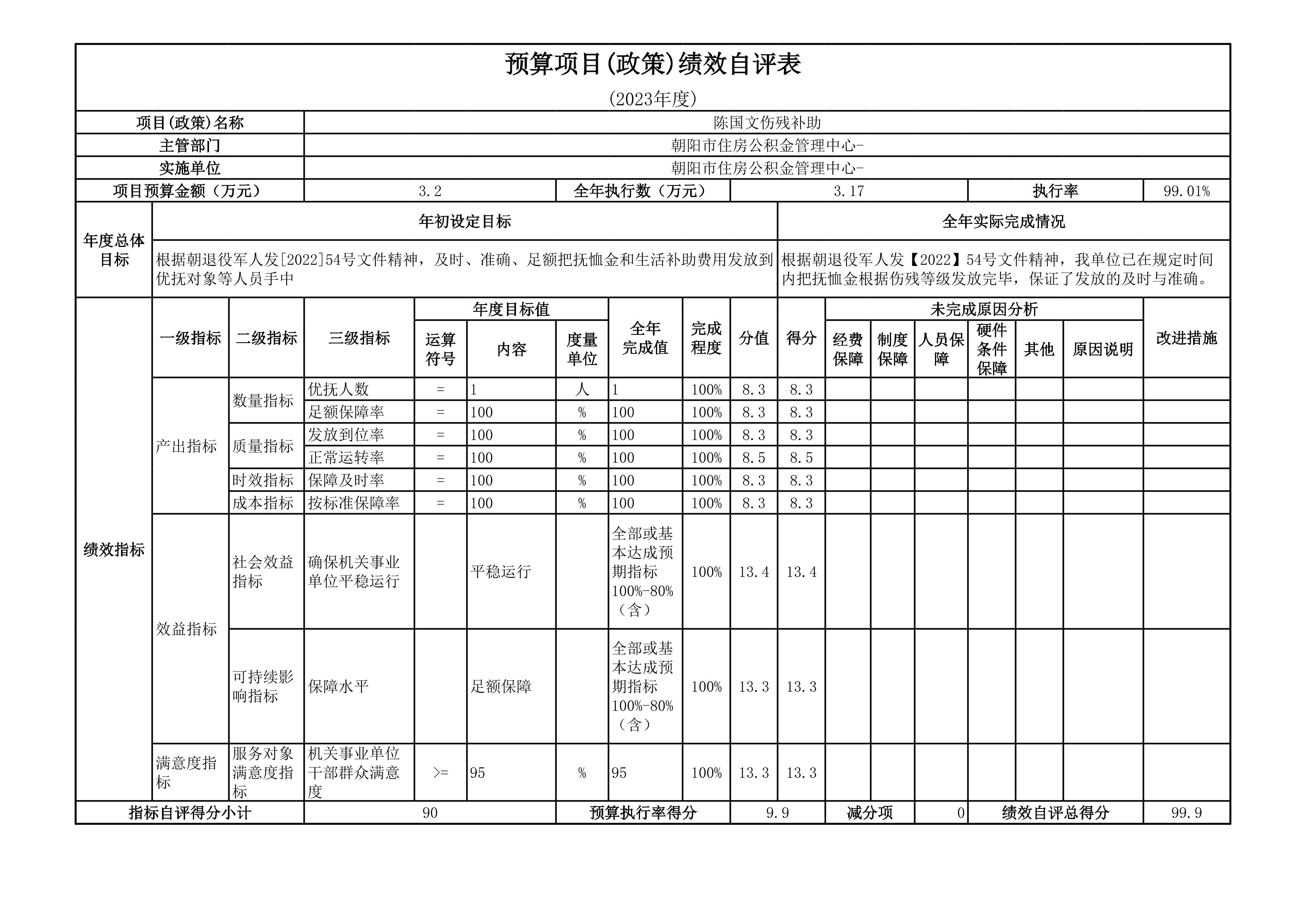(1)“陈国文伤残补助”项目自评综述:根据年初设定的的绩效目标,项目自评得分99.9分。项目全年预算数为3.2万元,全年执行数为3.17万元,完成年初预算的99.01%。项目绩效目标完成情况:根据朝退役军人发【2022】54号文件精神,我单位已在规定时间内把抚恤金根据伤残等级发放完毕,保证了发放的及时与准确。