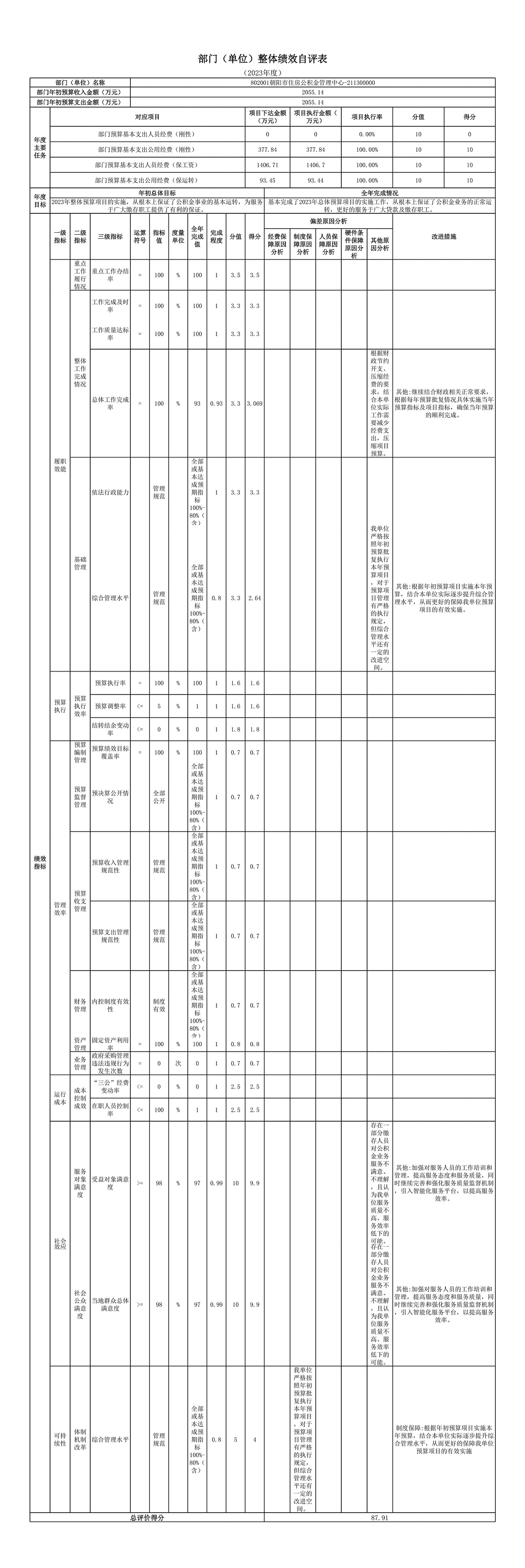 组织对1个单位开展整体绩效自评,涉及资金1877.98万元,自评平均分87.91分。《部门(单位)整体绩效自评表》见附件。