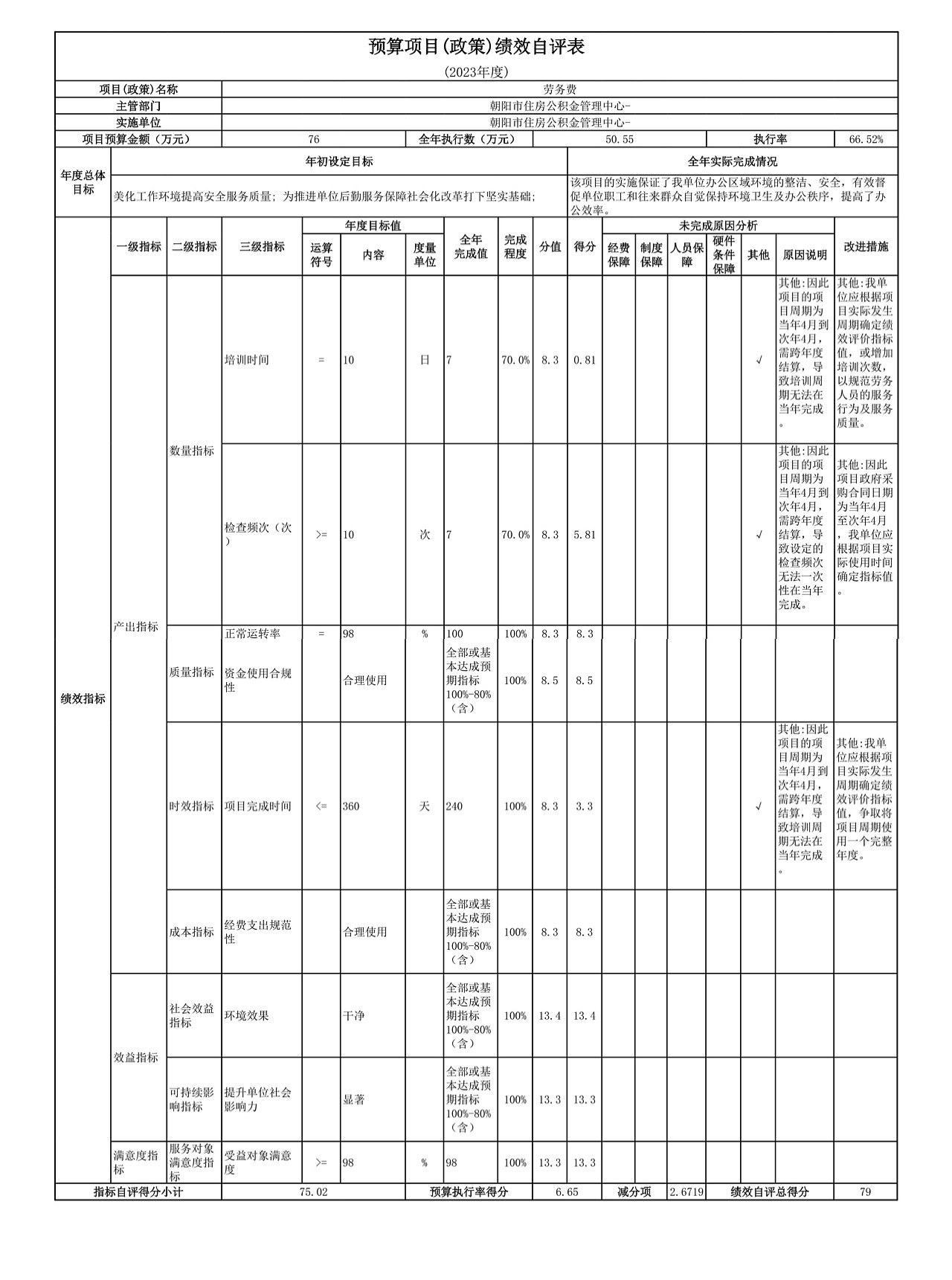 (2)“劳务费”项目自评综述:根据年初设定的绩效目标,项目自评得分79分。项目全年预算数为76万元,全年执行数为50.55万元,完成预算的66.52%。项目绩效目标完成情况:该项目的实施保证了我单位办公区域环境的整洁、安全,有效督促单位职工和往来群众自觉保持环境卫生及办公秩序,提高了办公效率。发现的主要问题及原因:因此项目的项目周期为当年4月到次年4月,需跨年度结算,导致培训周期无法在当年完成。下一步改进措施:我单位应根据项