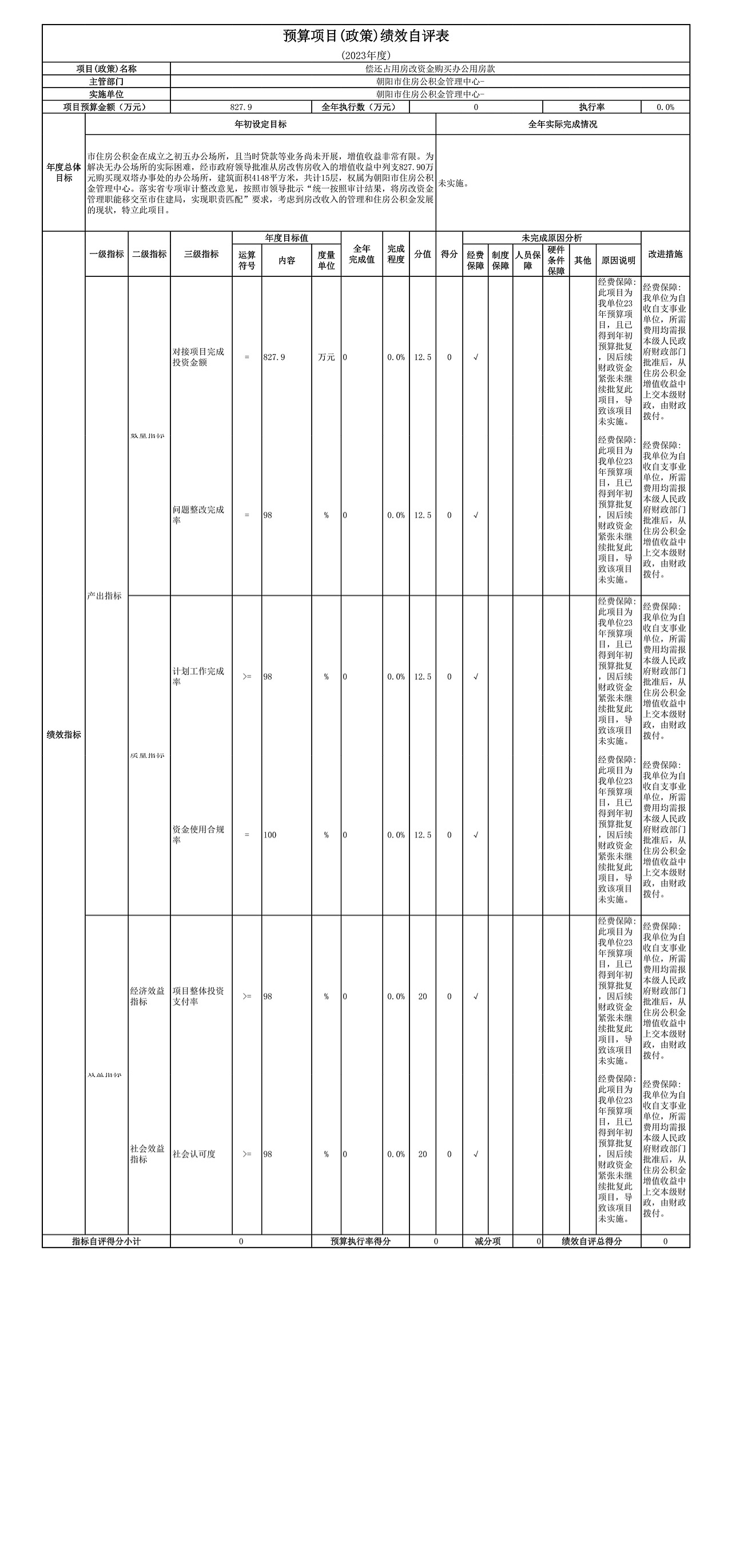 (3)“偿还占用房改资金购买办公用房款”项目自评综述:根据年初设定的绩效目标,项目自评得分0分。项目全年预算数827.90万元,全年执行数为0万元,完成年初预算的0%。项目绩效目标完成情况:未实施。