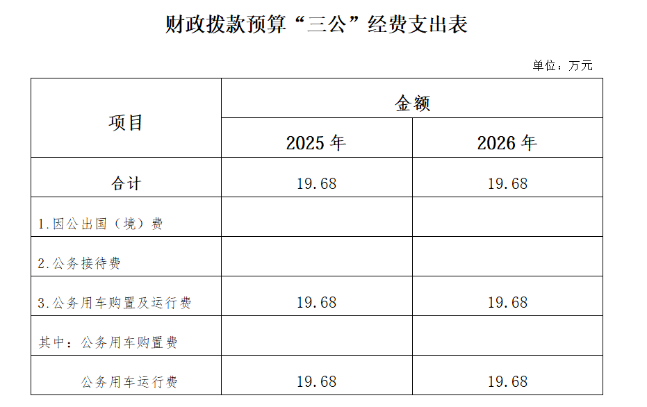 2026年,朝阳市住房公积金管理中心财政拨款预算安排的“三公”经费预算为19.68万元,比上年减少(增加)0万元,下降(增长)0%。其中: