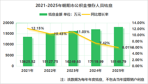 2025年度缴存职工结息为18148.79万元,同比增长6.01%,近五年的平均增长率8.02%。