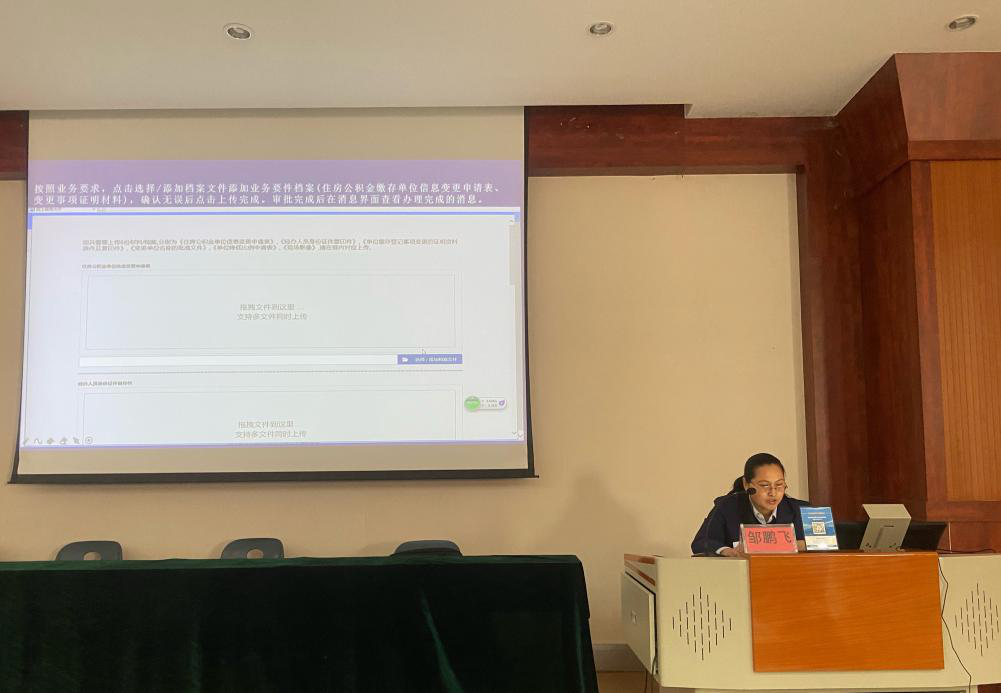 朝阳办事处邹鹏飞作为此次培训会的主讲人,以ppt的形式为大家详细讲解了单位汇缴的网厅业务办理流程及常见问题的处理方法。
